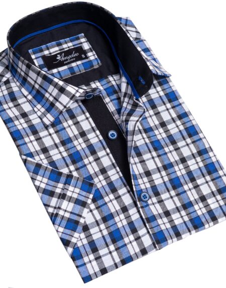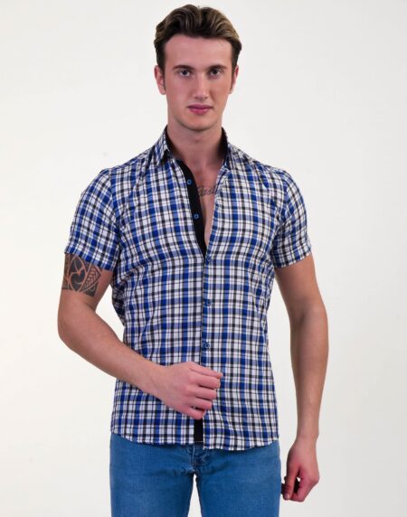 Blue & White Checkered Mens Short Sleeve Button up Shirts - Tailored Slim Fit Cotton Dress Shirts