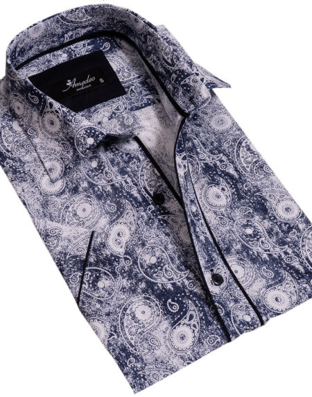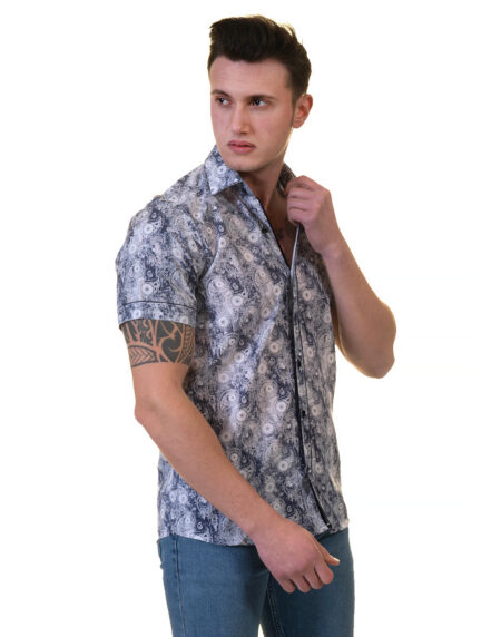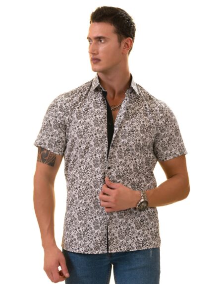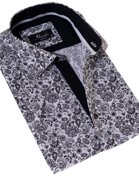 Black & White Paisley Short Sleeve Button-Up Shirt, Slim Fit Cotton Dress Shirt