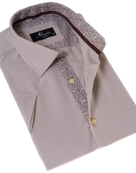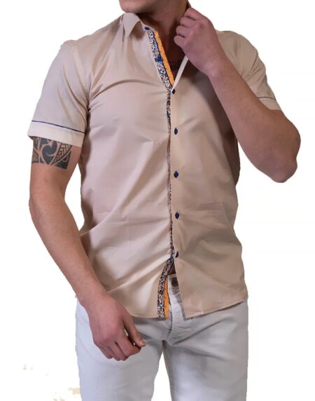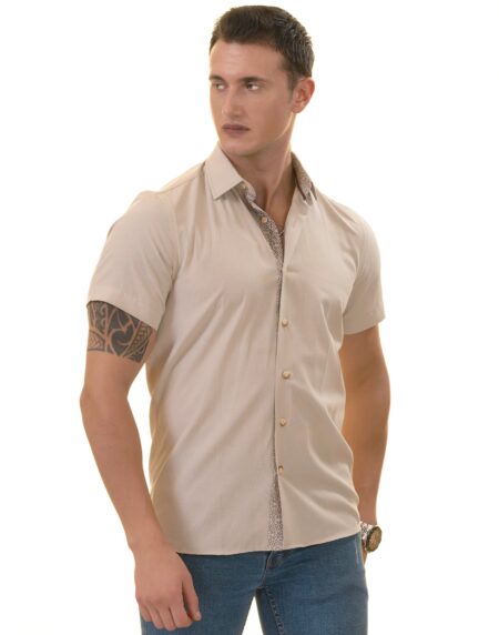 Beige Mens Short Sleeve Button up Shirts - Tailored Slim Fit Cotton Dress Shirts