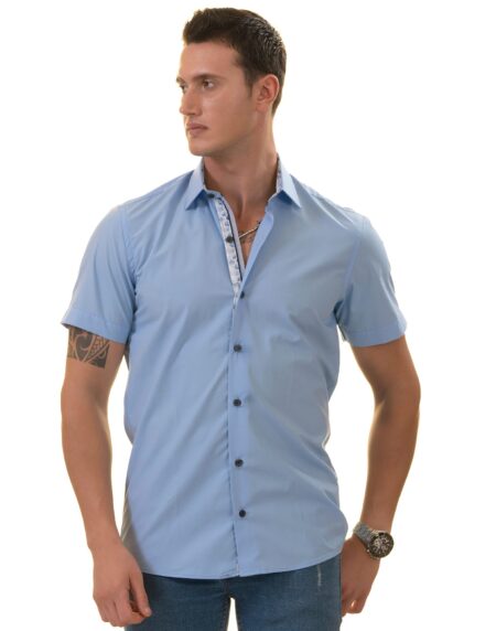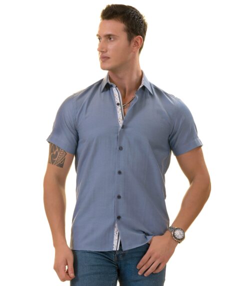 Blue Mens Short Sleeve Button up Shirts - Tailored Slim Fit Cotton French Cuff Shirts