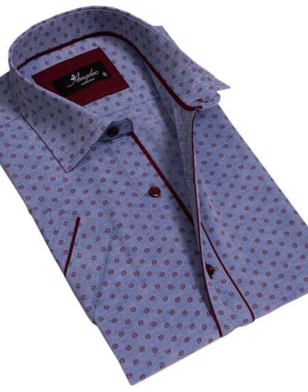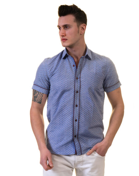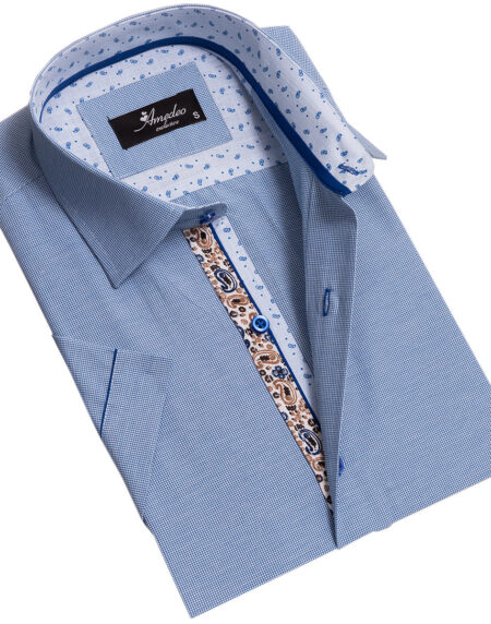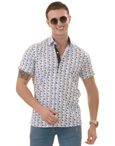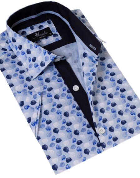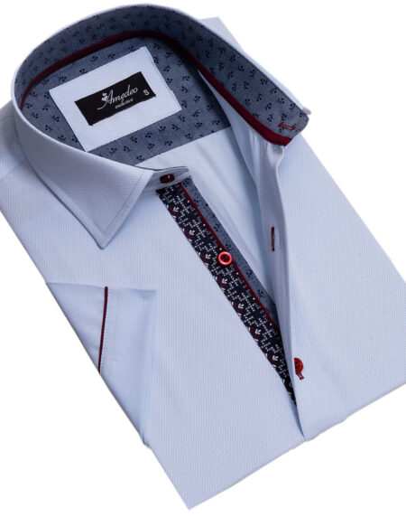 Blue and White Mens Short Sleeve Button up Shirts - Tailored Slim Fit Cotton French Cuff Shirts
