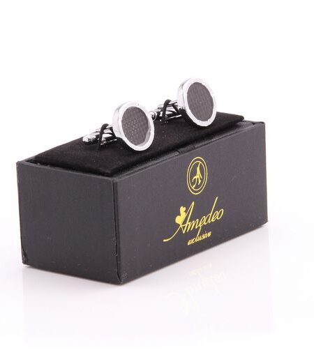Silver + Black Carbon Fiber Mens Stainless Steel Round Cufflinks for Shirt with Box - Hand Crafted