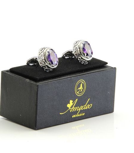 Silver with Purple Mens Stainless Steel Big Stone Cufflinks for Shirt with Box - Hand Crafted