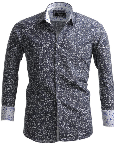 Grey Blue Floral Mens Slim Fit French Cuff French Cuff Shirts with Cufflink Holes - Casual and Formal
