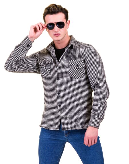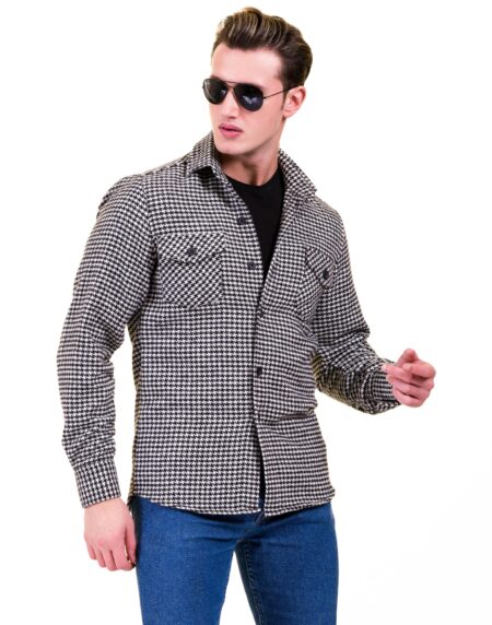 Black White Harringbone Mens Slim Fit Designer French Cuff Shirt - tailored Cotton Shirts for Work and Casual Wear