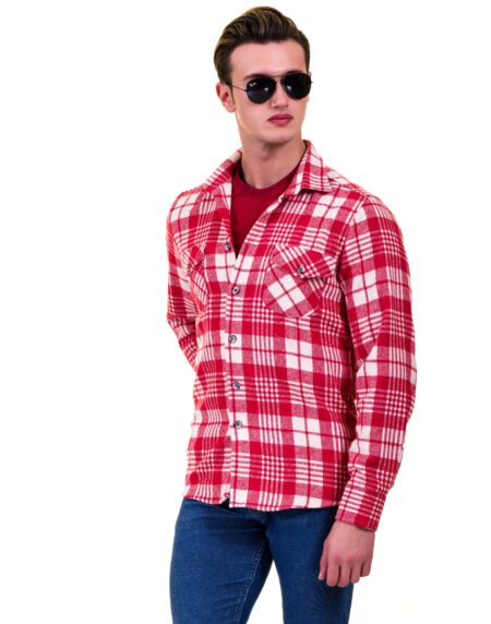 Red White Check Mens Slim Fit Designer Dress Shirt - tailored Cotton Shirts for Work and Casual Wear