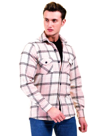 Salmon Pink White Check Mens Slim Fit Designer Dress Shirt - tailored Cotton Shirts for Work and Casual Wear