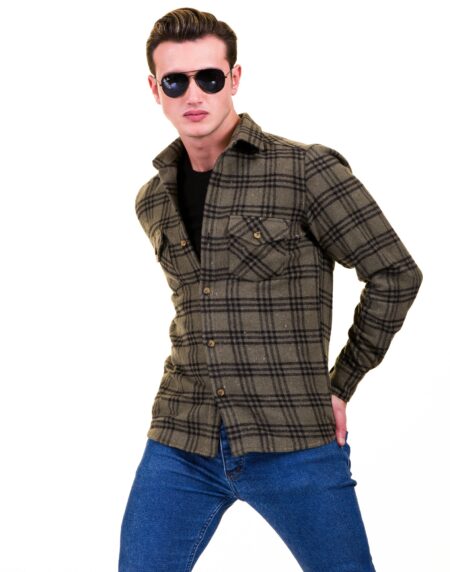 Olive Green Black Check Mens Slim Fit Designer Dress Shirt - tailored Cotton Shirts for Work and Casual Wear