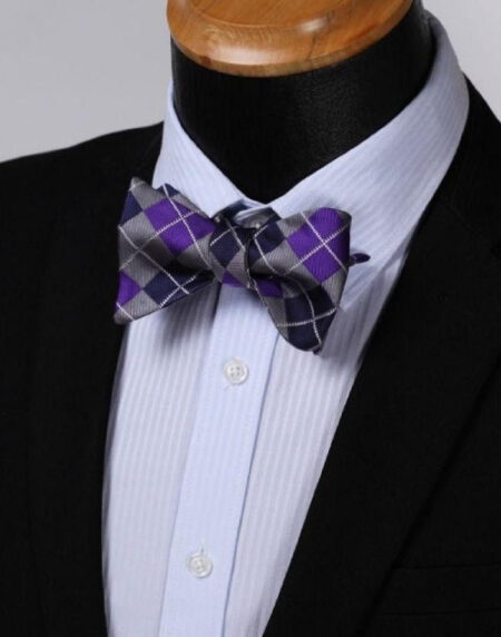 Purple Grey Check Mens Silk Self tie Bow Tie with Pocket Squares Set