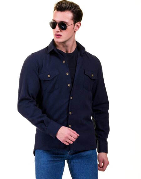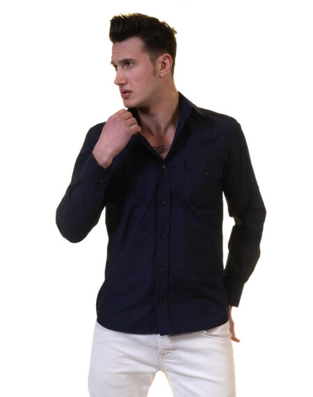 Solid Navy Blue Mens Slim Fit Designer Dress Shirt - tailored Cotton Shirts for Work and Casual Wear