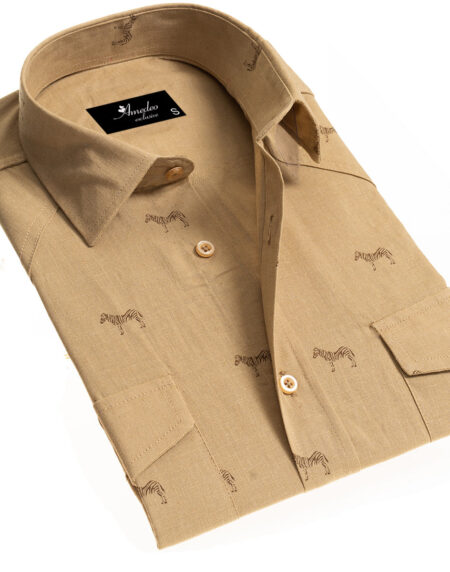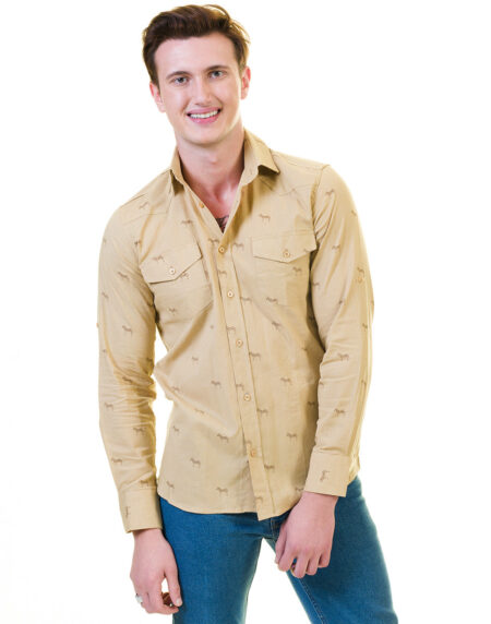 Solid Tan Safari Mens Slim Fit Designer Dress Shirt - tailored Cotton Shirts for Work and Casual Wear