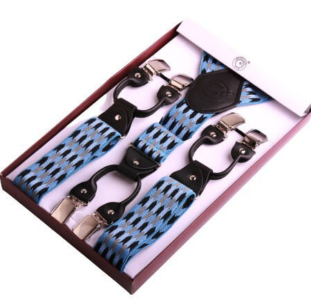 Men's Elastic Y Blue Beige Check Strap Dual Clip on High Quality Premium Suspenders