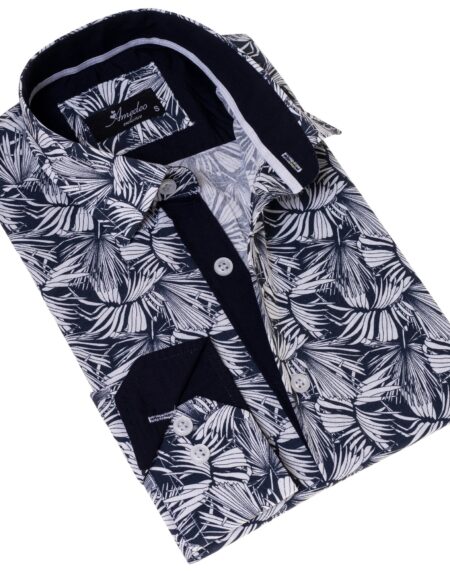 Black White Leaves French Cuff Shirt - Slim Fit Cotton Shirt for Men - Work & Casual