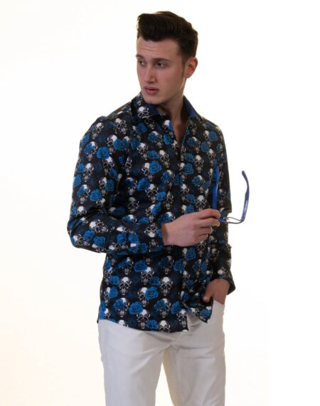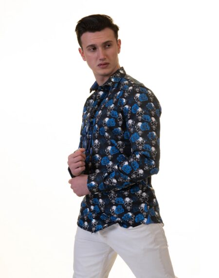 Black White Blue Skulls Mens Slim Fit Designer French Cuff Shirt - tailored Cotton Shirts for Work and Casual Wear