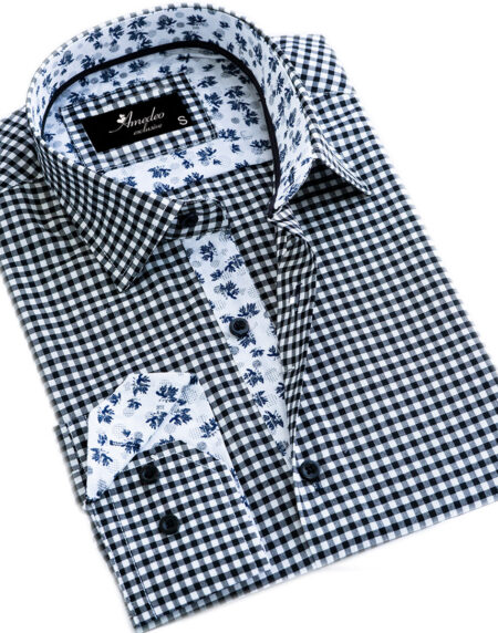 Black White Checkered with Light Blue Floral Mens Slim Fit Designer French Cuff Shirt - tailored Cotton Shirts for Work and Casual Wear