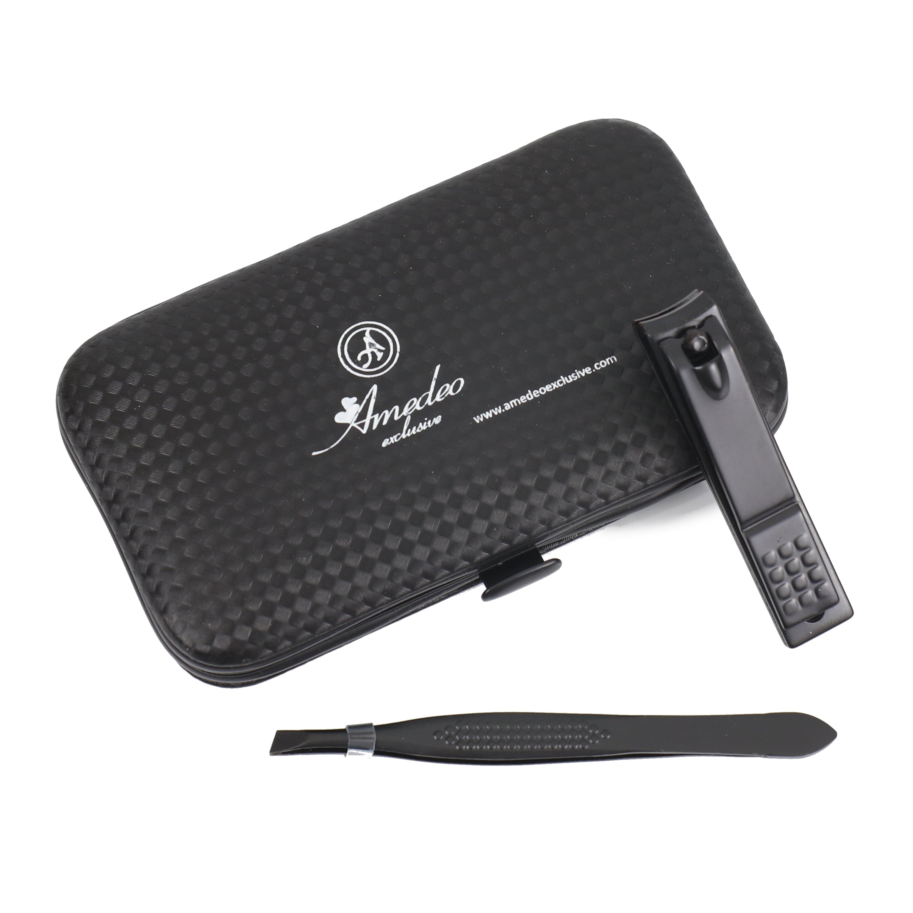 Amedeo Exclusive presents the stainless steel Manicure Pedicure Kit. This Manicure Pedicure Kit includes nail clippers, pedicure pliers, tweezers, cuticle clippers, Nail file, eyebrow tweezers, ear pick, cuticle pusher, scissors, and more.