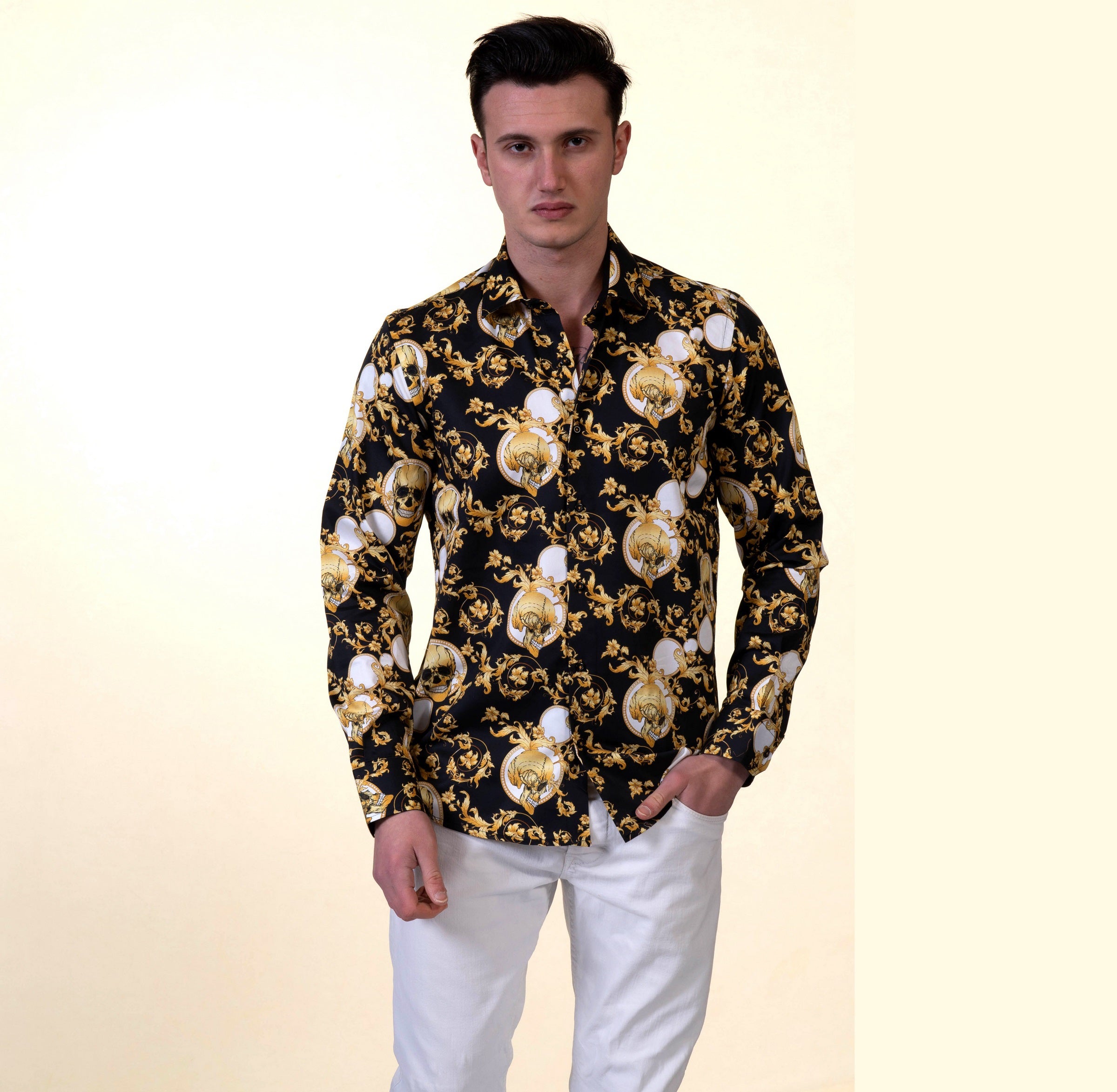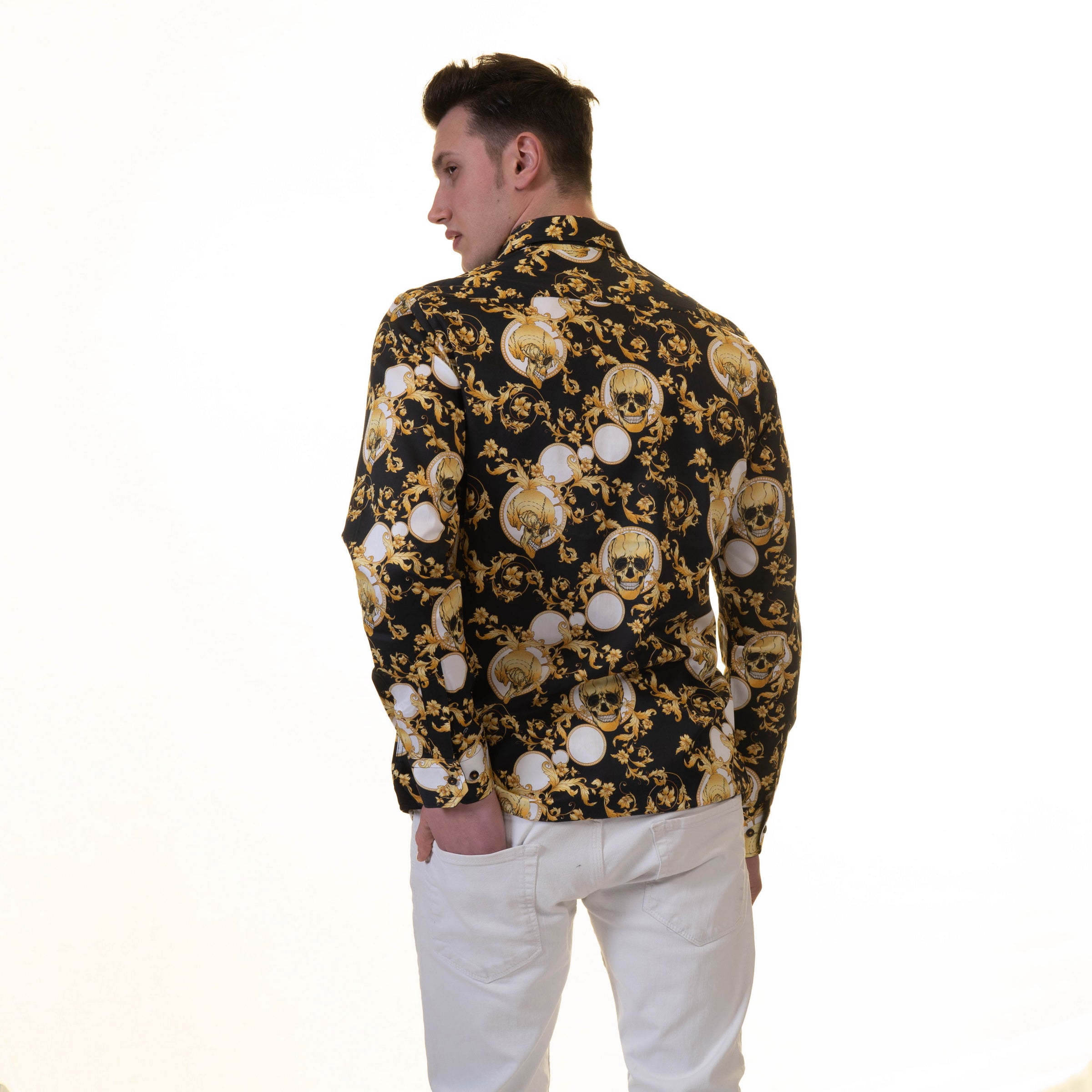 Black with Gold Skulls Mens Slim Fit Designer French Cuff Shirt – tailored Cotton Shirts for Work and Casual Wear