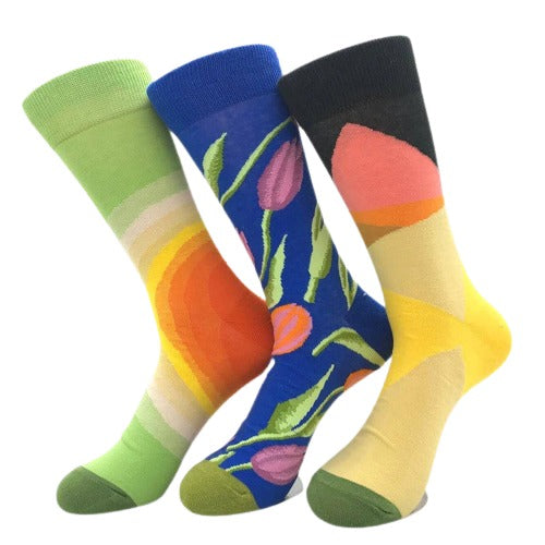 Floral Printed Mens Colorful Crew Socks – Premium Cotton Fun socks with Soft Elastic – 3 Pack Bundle