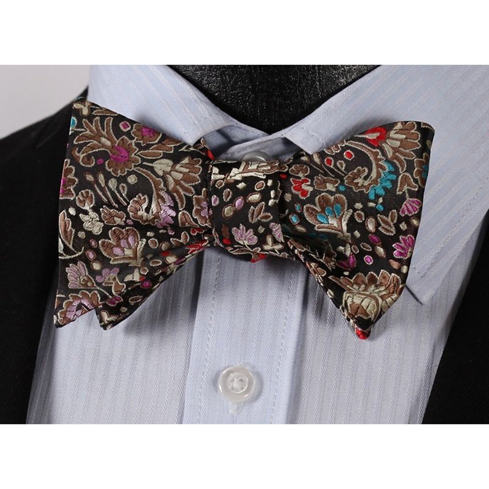 Men’s Silk Brown Pink Floral Self Bow Tie Handkerchief