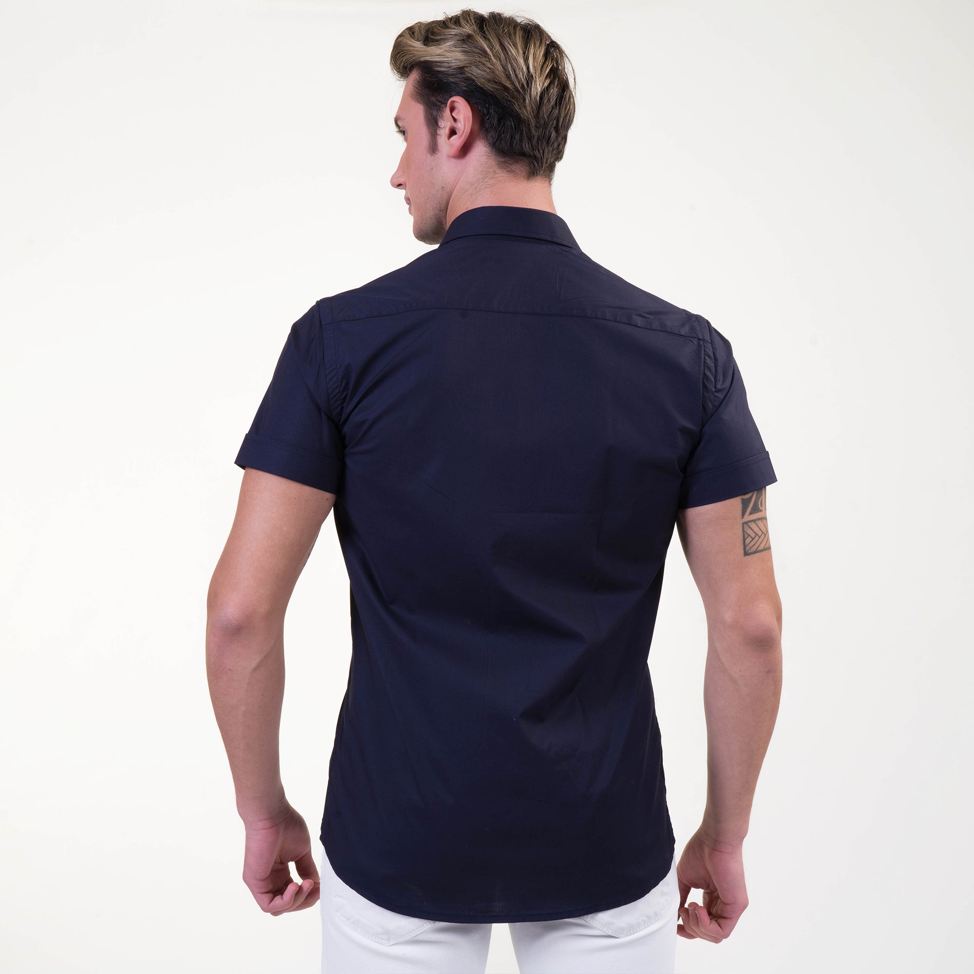 Flattering Tailor Fit: Highlight your physique and give yourself a smart and professional appearance with this Midnight Blue Mens Dress Shirt. This Short Sleeve Button-up Shirt also offers great comfort as it is made from the finest quality fabrics available. This shirt comes in multiple size options allowing for you to choose the perfect fit!