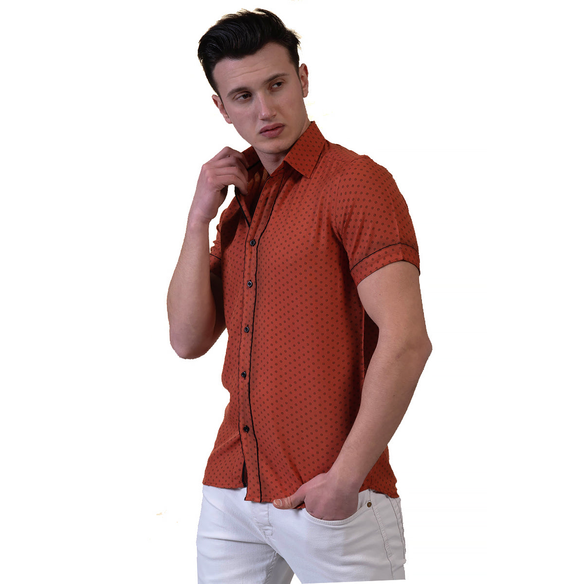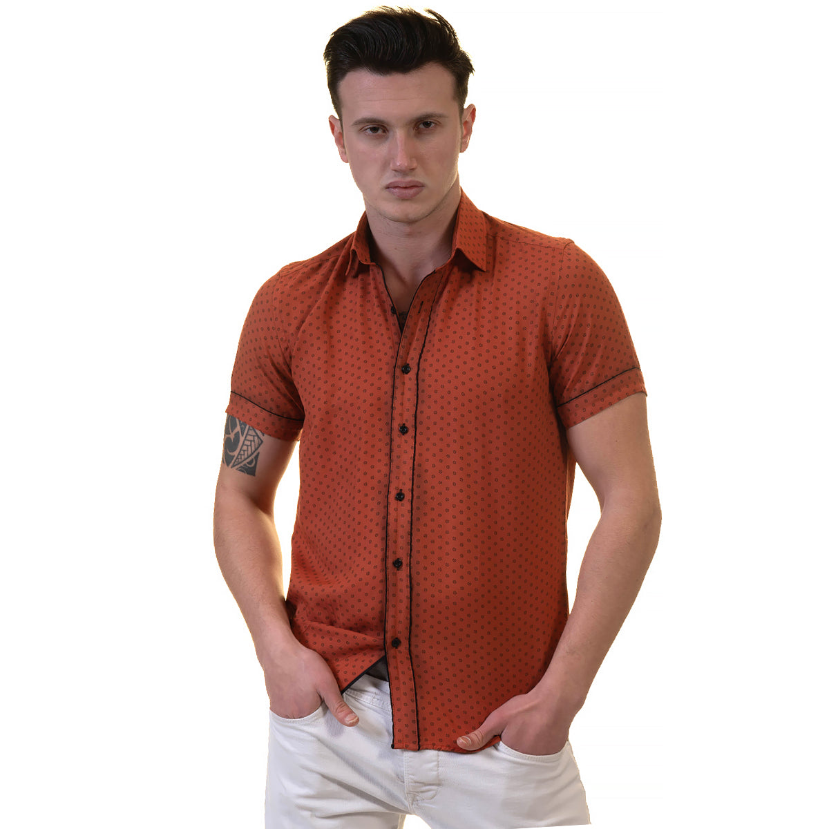 Orange / Reddish Mens Short Sleeve Button up Shirts – Tailored Slim Fit Cotton Dress Shirts
