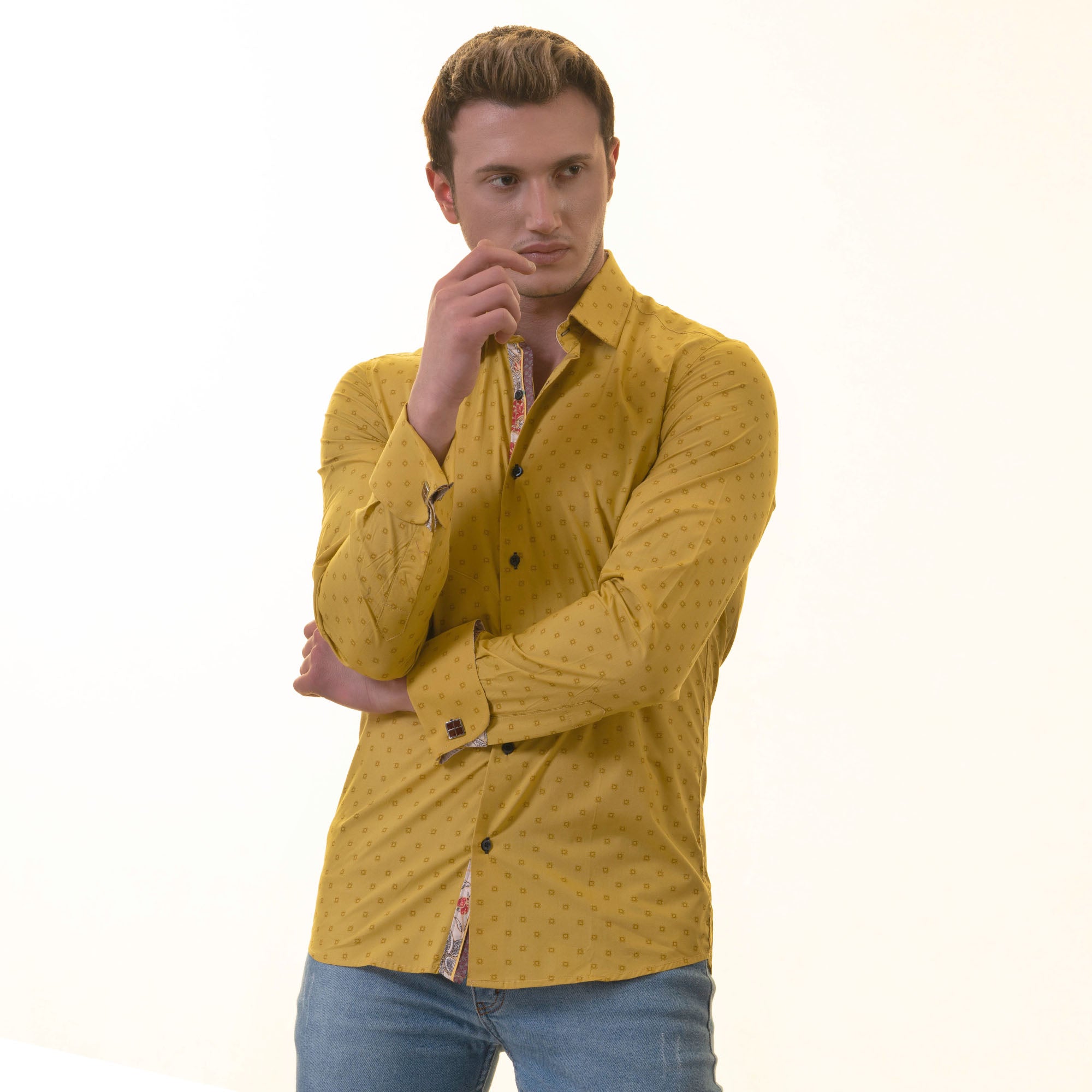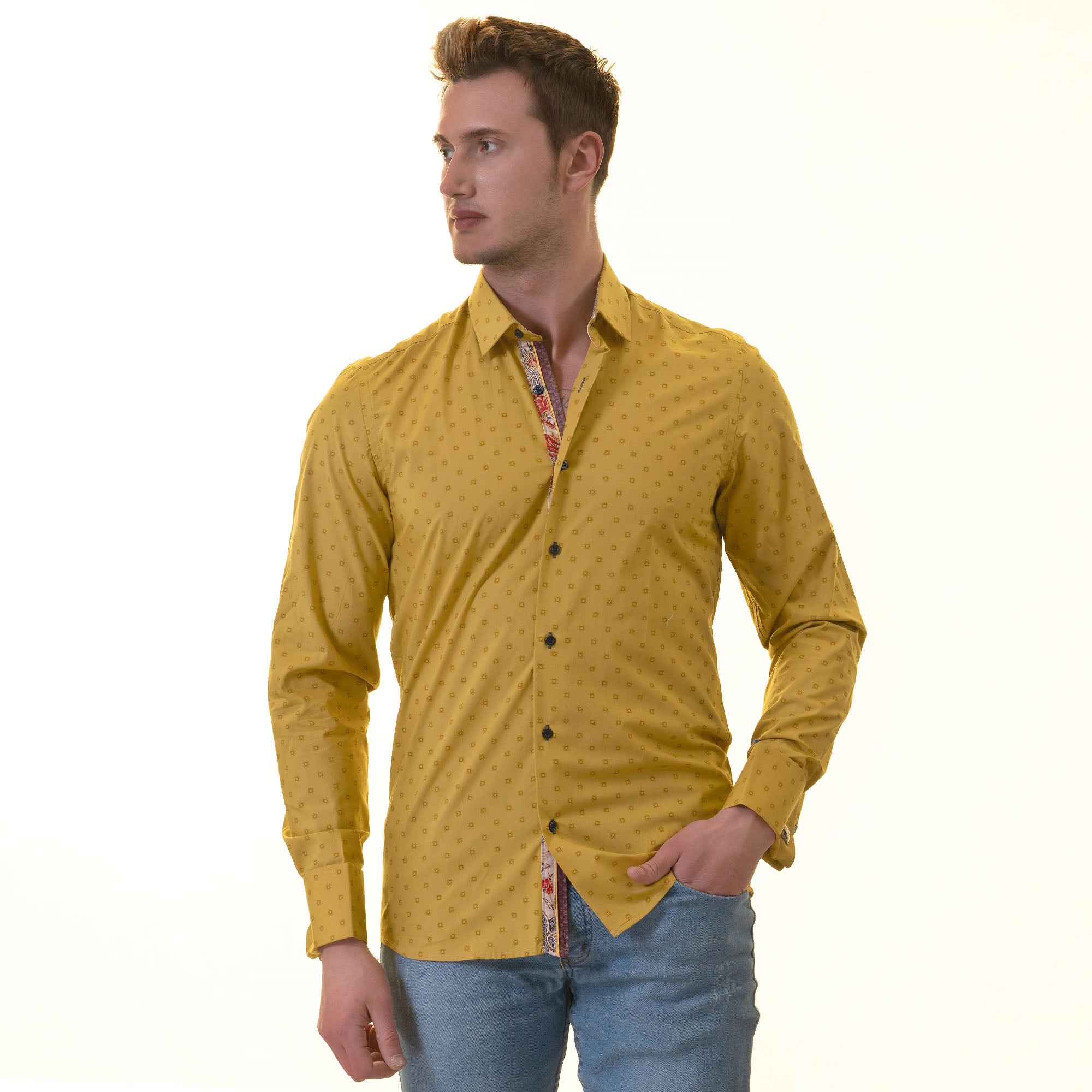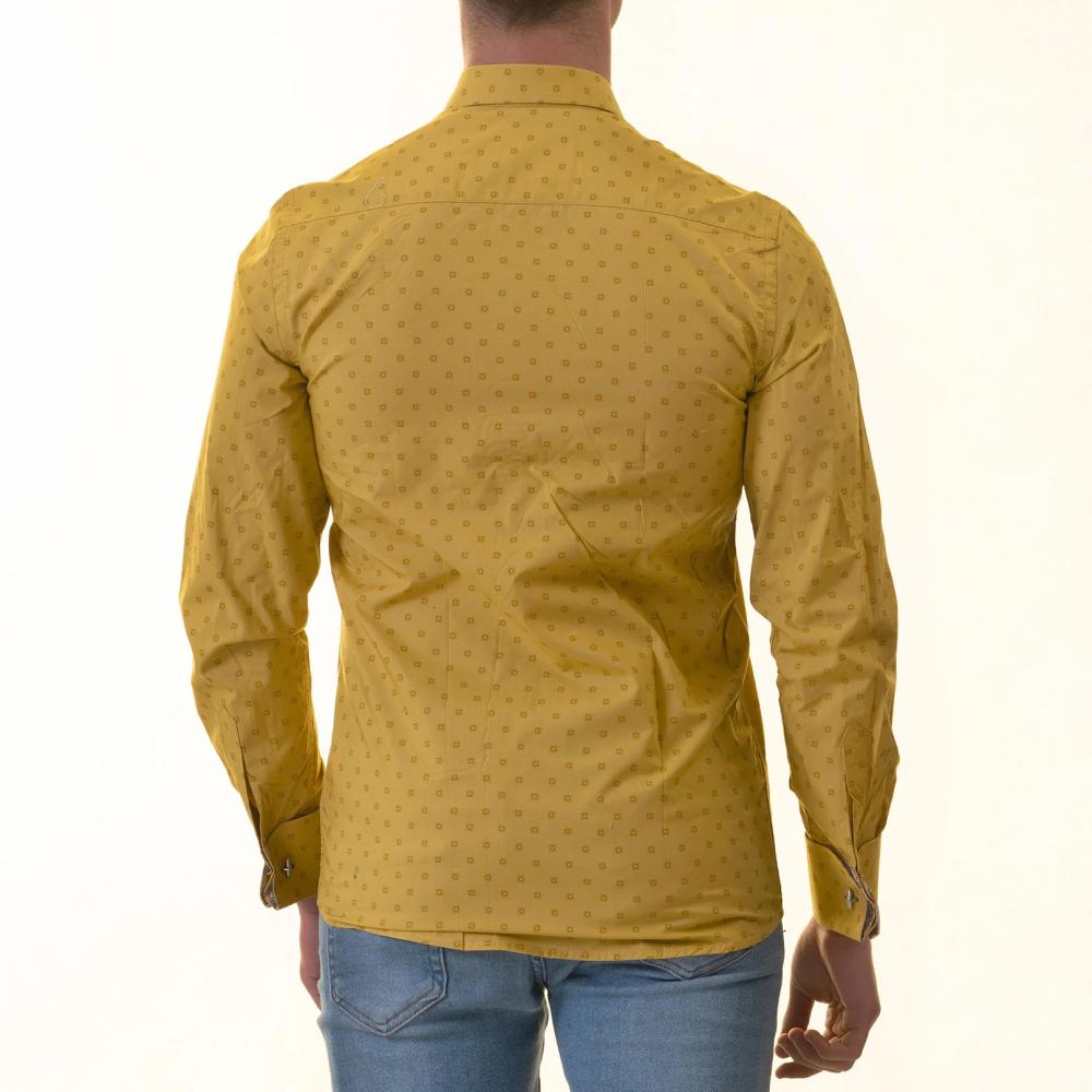 Paisley French Cuff Shirt – Slim Fit Long-Sleeved Shirt (Mustard Printed Inside)