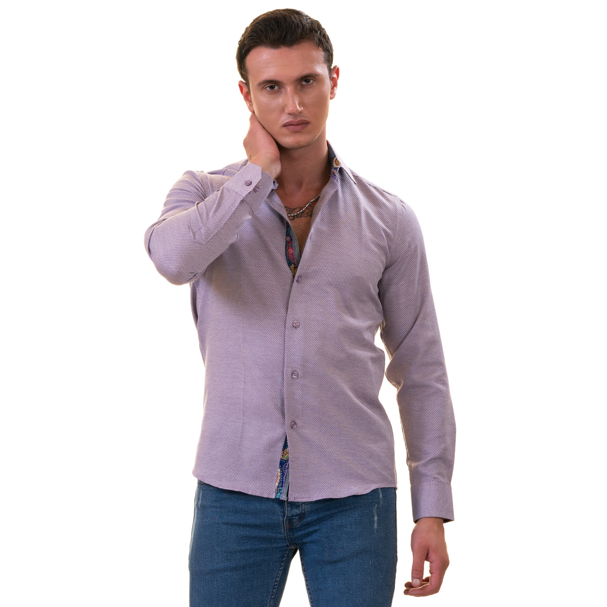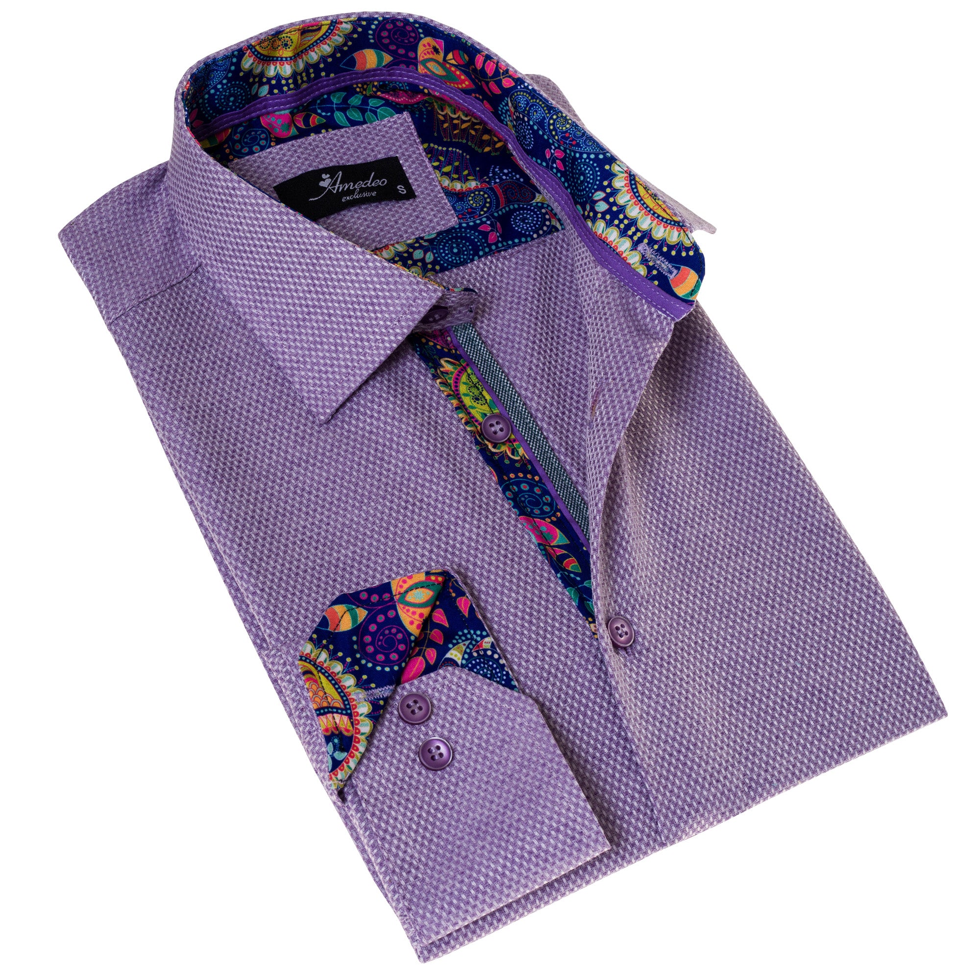 Amedeo Exclusive presents the Purple Shirt Mens, perfect for formal or casual wear. This shirt gives you two looks in one with its designer cuff for customizable style.