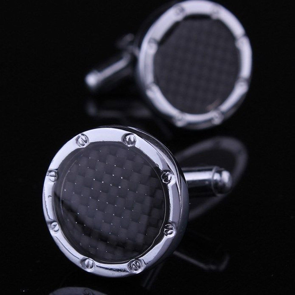 Silver + Black Carbon Fiber Mens Stainless Steel Round Cufflinks for Shirt with Box – Hand Crafted