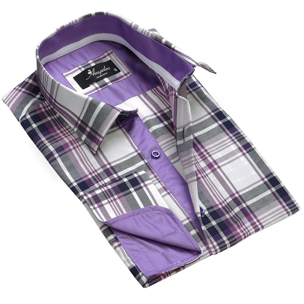 White Purple Check Mens Slim Fit French Cuff Shirts with Cufflink Holes – Casual and Formal