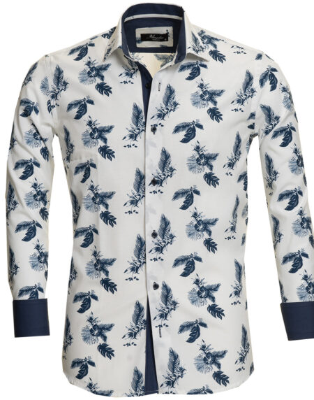 White Navy Floral Digital Men's Slim Fit Designer Dress Shirt - Tailored Cotton